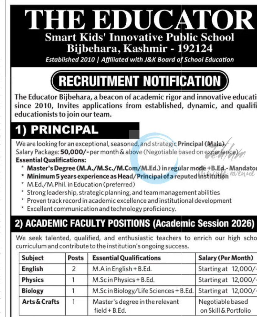 The Educator Bijbehara, a beacon of academic rigor and innovative education since 2010, invites applications from established, dynamic, and qualified educationists to join our team for the Academic Session 2026.